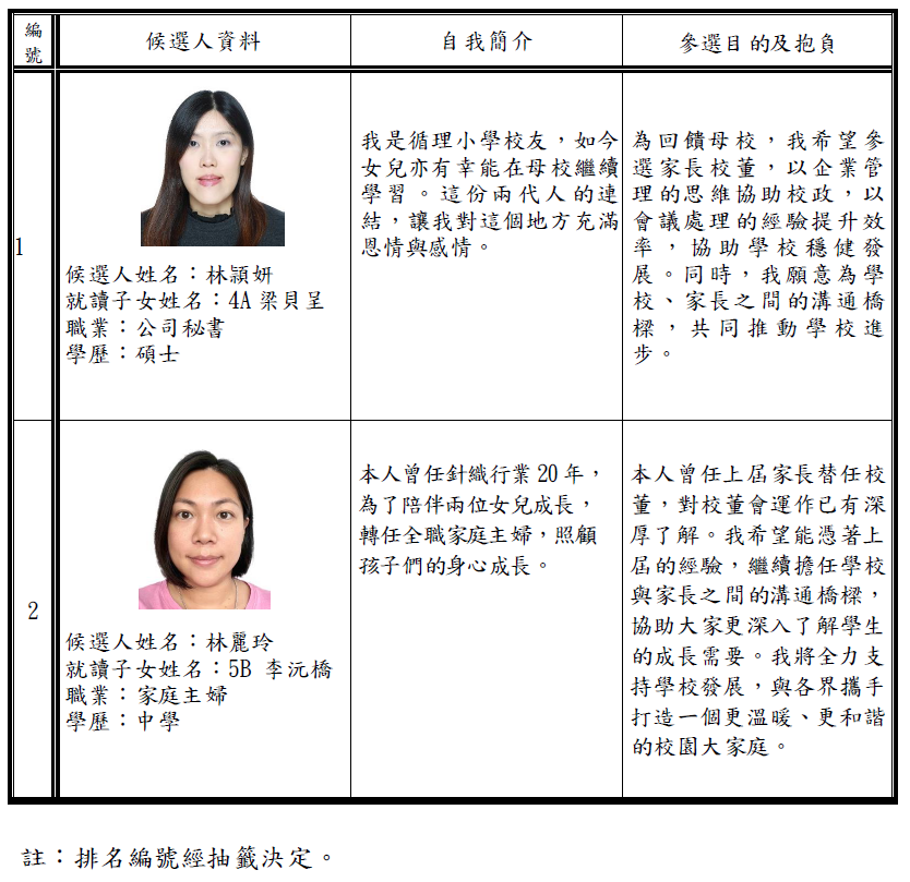 本屆家長校董共有兩位參選者,以下是候選人的資料。懇請各位家長填妥選票並放入信封內,著 貴子女於5月11日(星期一)下午1時前交回班主任。