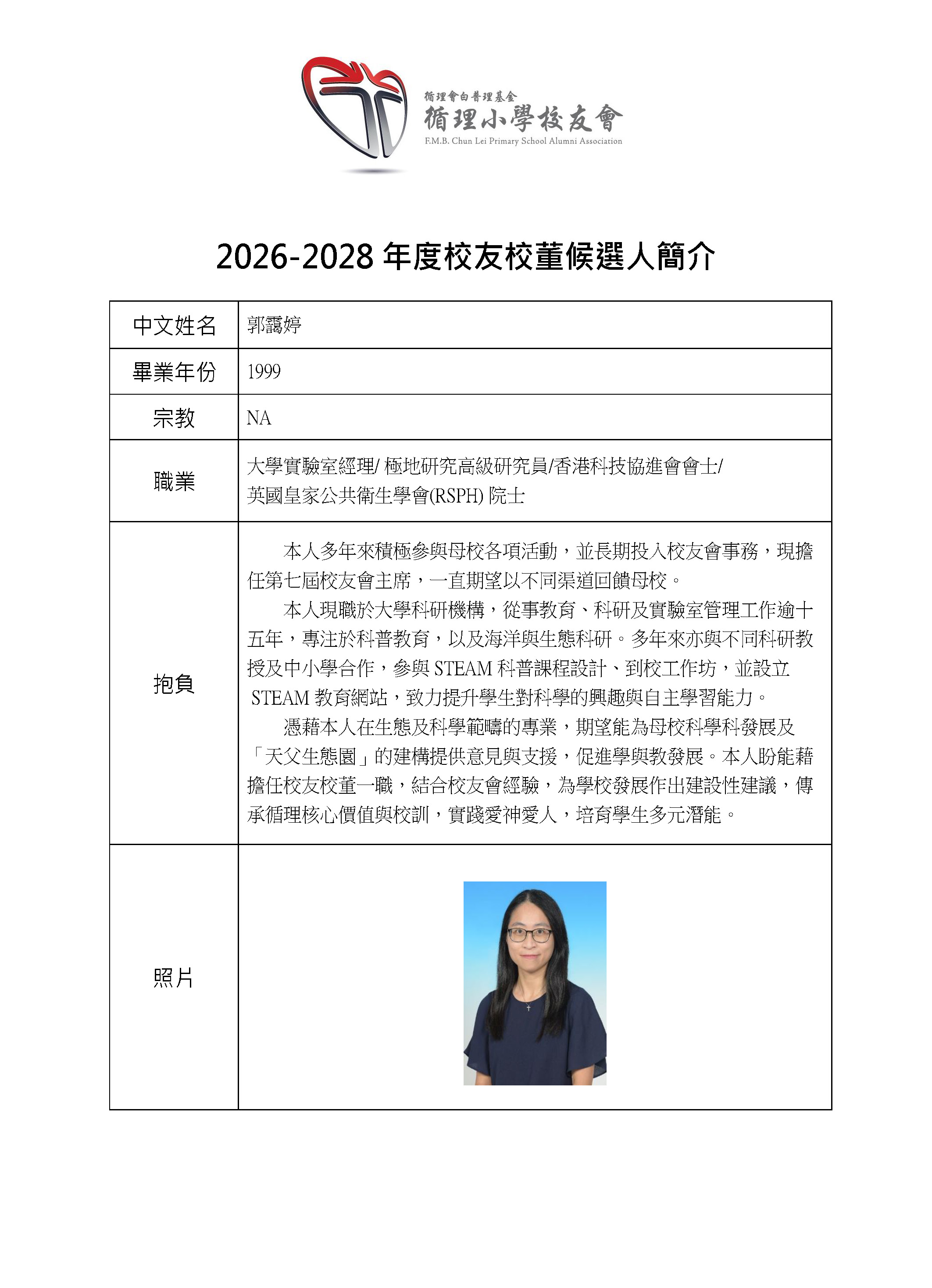 請參考校友校董候選人簡介,按本校校友會會章條例:如候選人只有一位,則無須進行投票,選舉主任得宣佈該候選人自動當選。故此,選舉主任將於3月21日的校友會會員大會上宣布郭靄婷小姐自動當選。